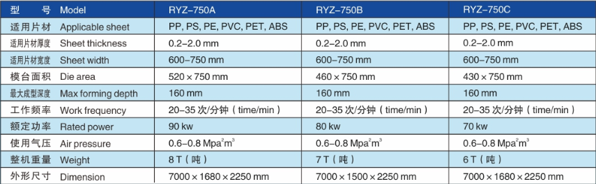 RYZ-750 Series of Full-automatic Hydraulic CUP-making Machine developed by our company is a fully automatic plastic container’s forming machine which features in high speed and high efficiency. This machine is applicable to the production of plastic sheet material, such as PS, PP, PVC, PET and ABS.
